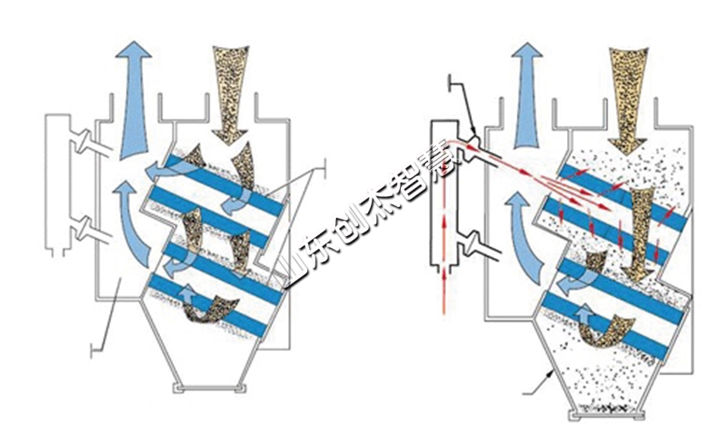 在除塵器的原氣側(cè),也就是說在花板(多孔板)的下面,氣流以較低的速度穿過濾筒,而粉塵顆粒則會(huì)在穿透過程中被阻擋在濾芯的表面。過濾后的干凈空氣(過濾后的空氣)從主機(jī)的上部排出,然后通過相連的管道系統(tǒng)直接排放到室外或者均勻的送回車間。氣流組織所需的負(fù)壓是由風(fēng)機(jī)提供的,它既可以內(nèi)置,也可以是臥式的或者分體單獨(dú)擺放。而分離出來的粉塵則落在用于粉塵收集的灰桶里。按時(shí)間來控制的電磁閥打開后,儲(chǔ)存在壓縮空氣罐內(nèi)的壓縮空氣就會(huì)通過噴吹管,以與氣流組織相反的方向從干凈空氣側(cè)吹入濾芯里面,這樣就在運(yùn)行當(dāng)中將被分離出來的堆積在濾芯表面的粉塵反吹下來,并掉入垃圾排放裝置里面。