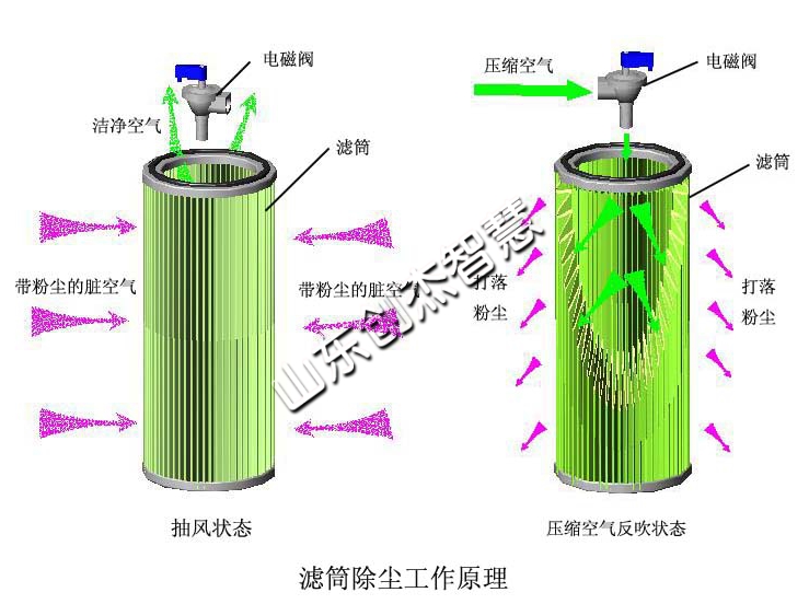 濾筒除塵器由進(jìn)風(fēng)管、排風(fēng)管、箱體、灰斗、清灰裝置、濾筒及電控裝置組成。